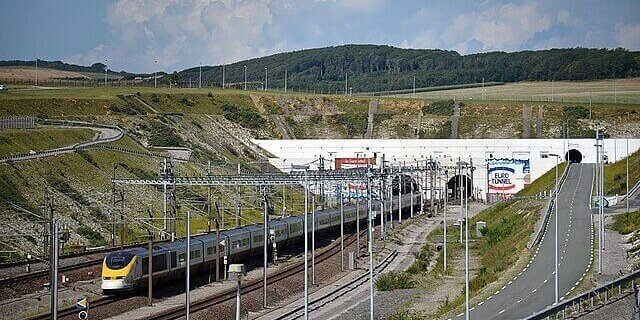 The Channel Tunnel runs beneath the English Channel, connecting the United Kingdom to France for rail travel.