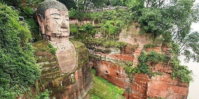The Leshan Giant Buddha is in Sichuan, China, carved into a cliff overlooking river confluences.