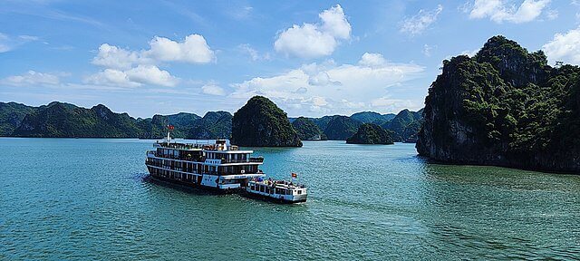 Hạ Long Bay is in Vietnam, famous for thousands of limestone islands rising from emerald waters.