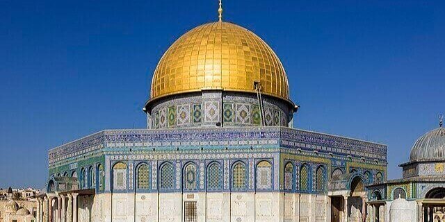The Dome of the Rock stands in Jerusalem on the Temple Mount/Haram al-Sharif, famed for its golden dome.