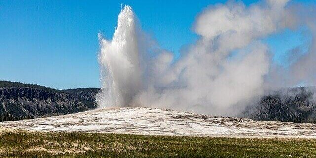 Old Faithful erupts in Yellowstone National Park, mainly in Wyoming, and is one of the park’s icons.