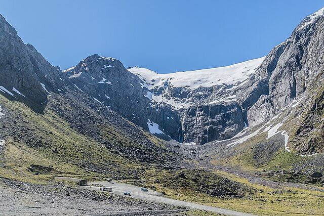 Milford Sound is in New Zealand’s South Island, a dramatic fjord with cliffs, waterfalls, and rainforests.